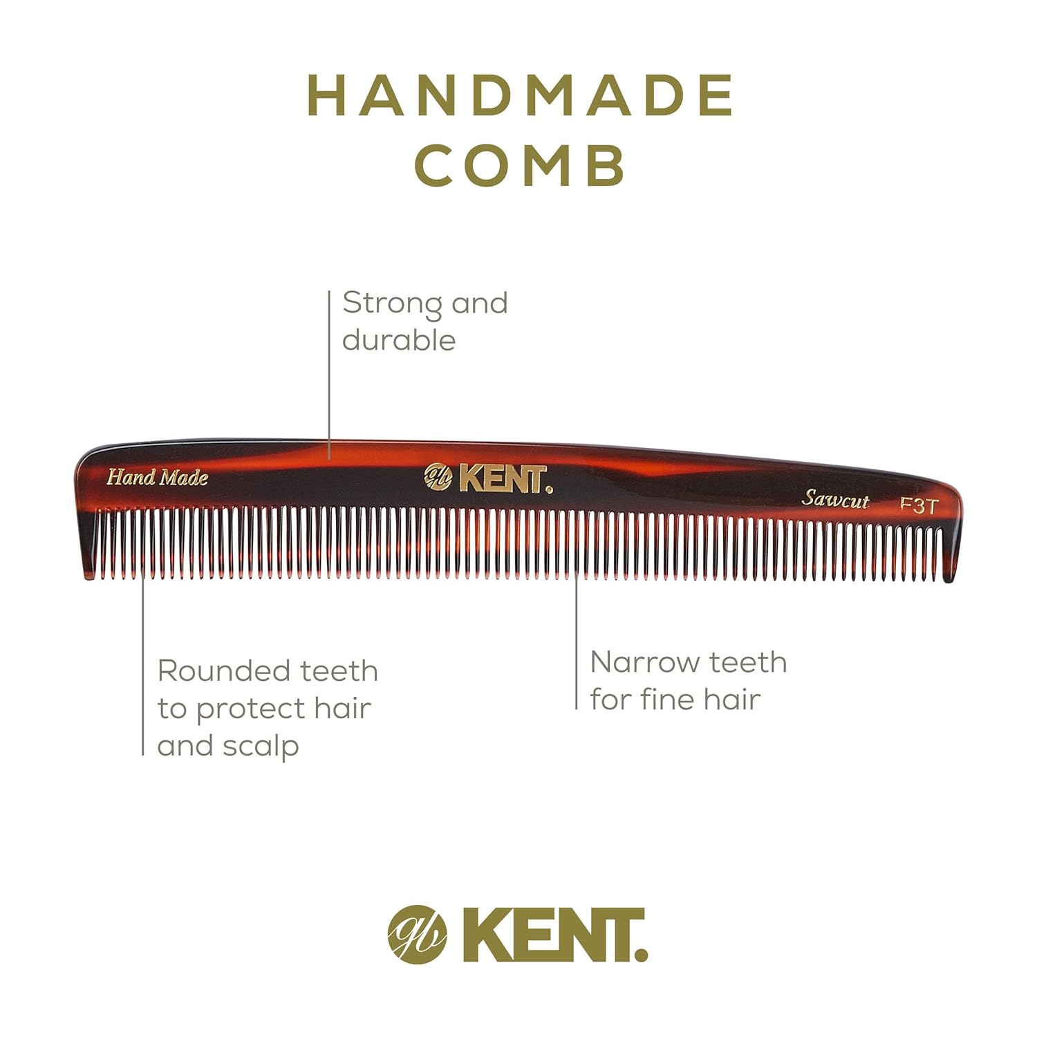 - Handmade Kent comb: Handmade from a large sheets of cellulose acetate rather than being molded. This material is tactile, flexible and strong, a non-petroleum based derived from plants that has been found to create less static in hair, and is saw-cut to ensure a smooth surface that will not pull or snag hair follicles