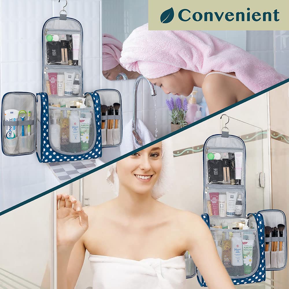 PAVILIA Extra Large Toiletry Bag Travel Bag for Women Men, Hanging Cosmetic Organizer, Water Resistant Makeup Bag for Accessories Toiletries, Travel Essentials Kit (Navy Polka Dot)