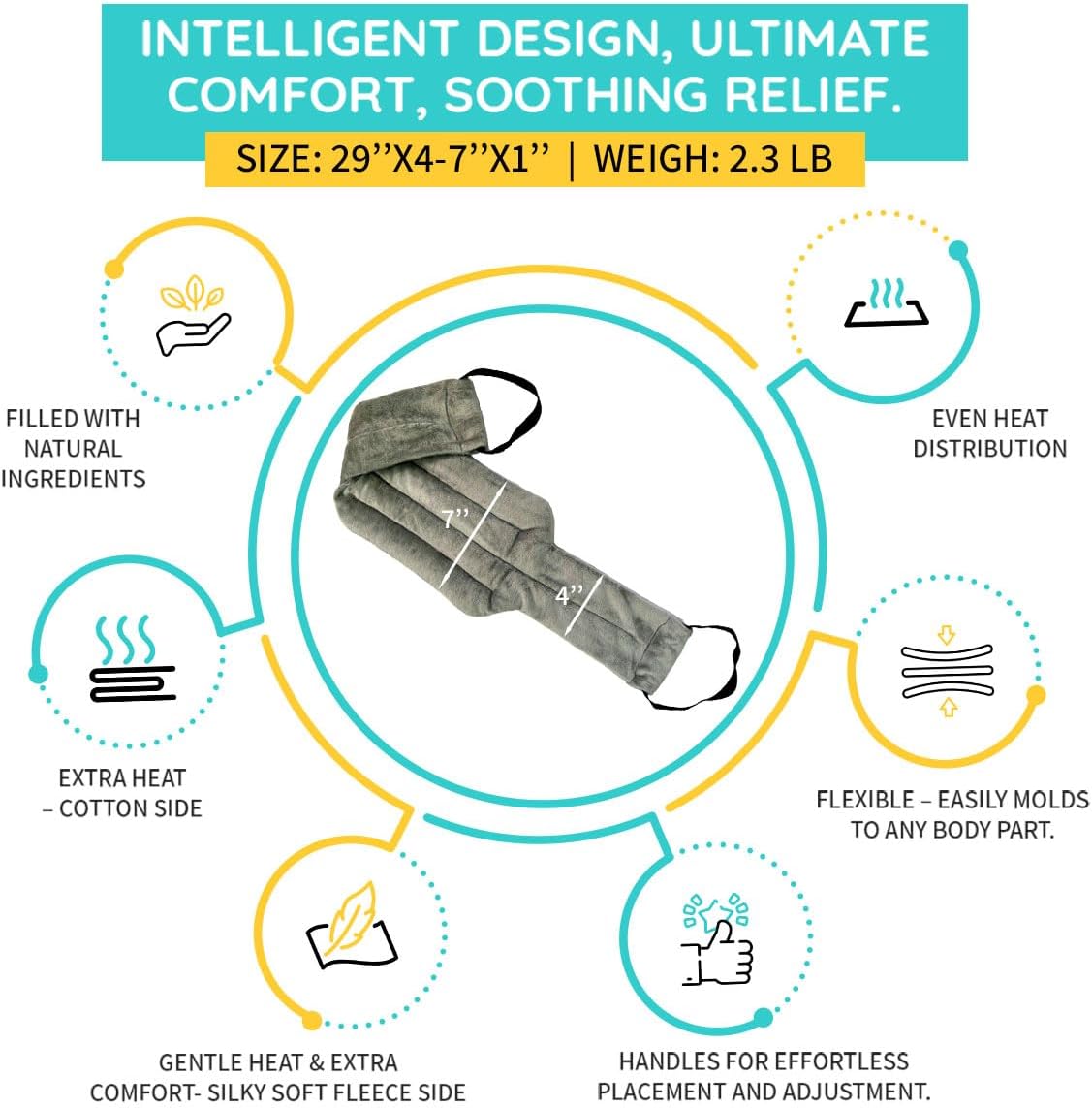 - FLEXIBLE & VERSATILE: Our heating pads heat up quickly and can easily be applied to any part of your body. It can be used as a neck heating pad, shoulder heating pad, or wrap heating pad for your back. Get relief on any part of your body that needs soothing. Our microwave heat pad even uses it's ideal weight to hold it in place and gently deliver heat therapy pressure.