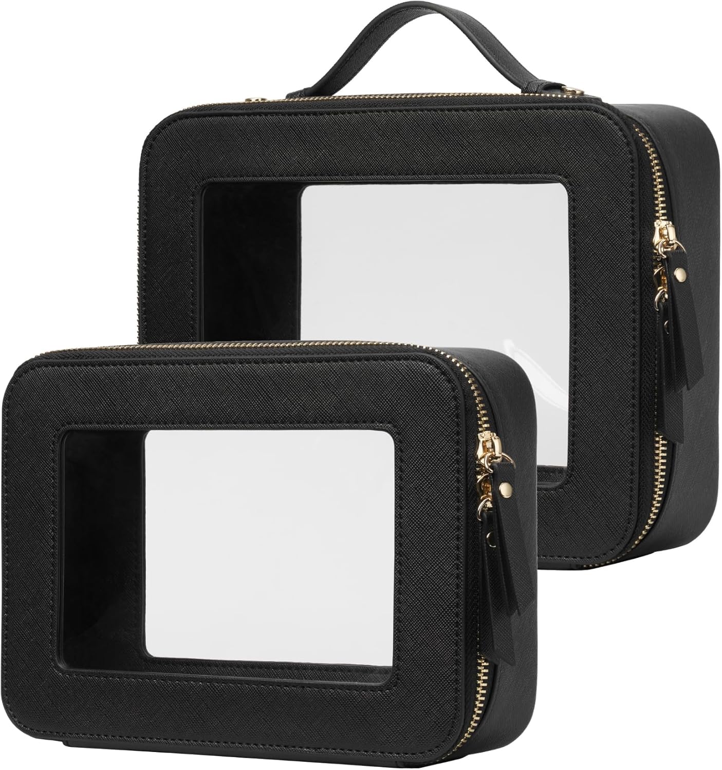 - [Premium Material and Durability] – The clear cosmetic case, both the exterior and interior, is crafted from high-grade saffiano faux leather, which is highly scratch resistant, durable and exceptionally easy to keep clean. It features a smooth zipper for secure closure, and elegant light gold metal hardware accents, adding a luxurious and sophisticated touch to the bag's overall design.