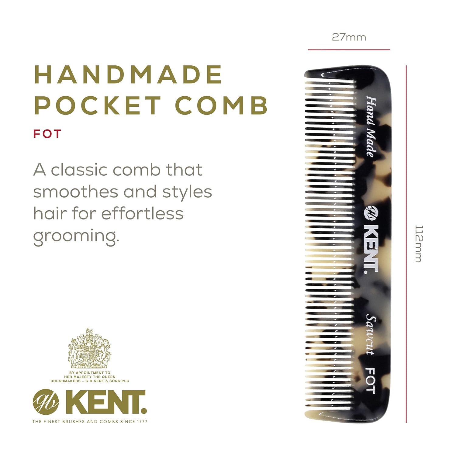 Kent FOT TW Fine Tooth Comb for Men - Handmade Pocket Comb for Travel, Styling, Fine or Thinning Hair, Mustache and Beard Care Handpolished Saw-Cut Made in England
