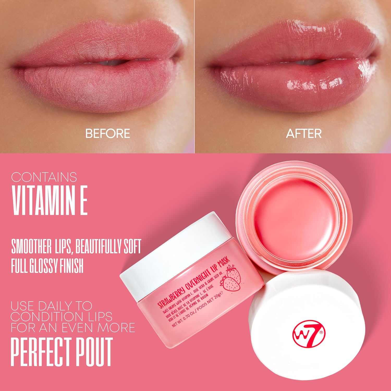 W7 Sweet Dreams Strawberry Lip Mask - Vitamin E, Aloe Vera and Grape Seed Oil - For Hydrated, Full Looking & Irresistible Lips - 0.67 Fl Oz