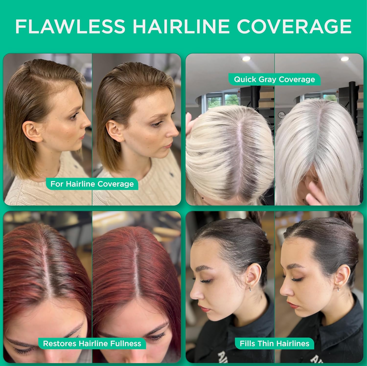 - WATER AND SWEAT RESISTANT: Our root cover up hair mascara is designed to withstand any weather conditions including wind and rain. Just use our hair line shadow powder and feel confident whether you're facing a rainy day or an active workout β your flawless look stays intact. Note, a tiny bit of hair spray is recommended, once applied donot touch even if it rains, it will stay firm and last until hair is washed with a shampoo