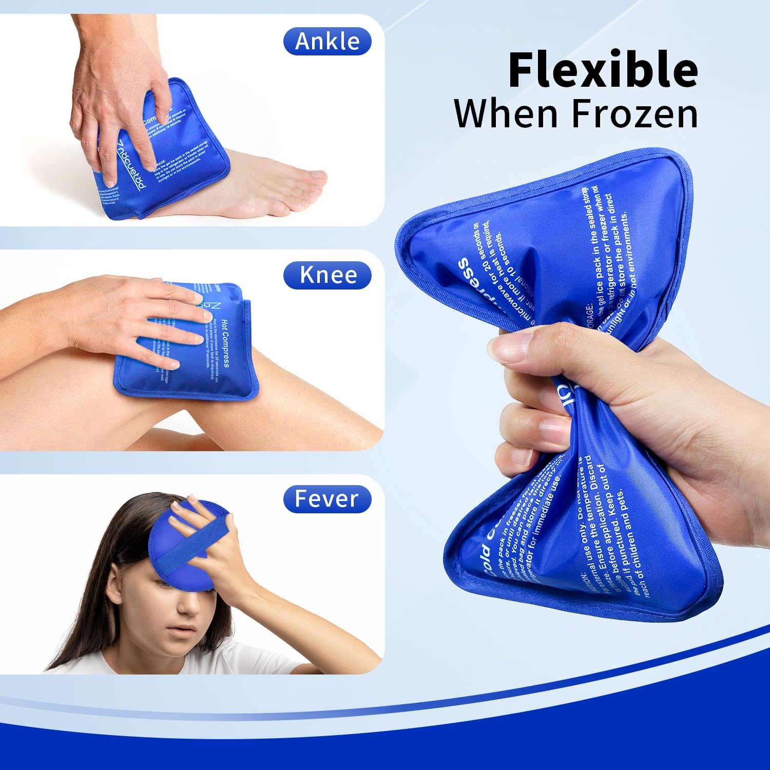 - Multi-functional:Keep pliable after frozen and stay cold for up to 20-30 minutes to achieve full heat or ice therapeutic benefits. Use this soft gel ice pack on your knee, ankle, shoulder, neck, head, face, jaw, elbow, wrist, arm or anywhere else you need.