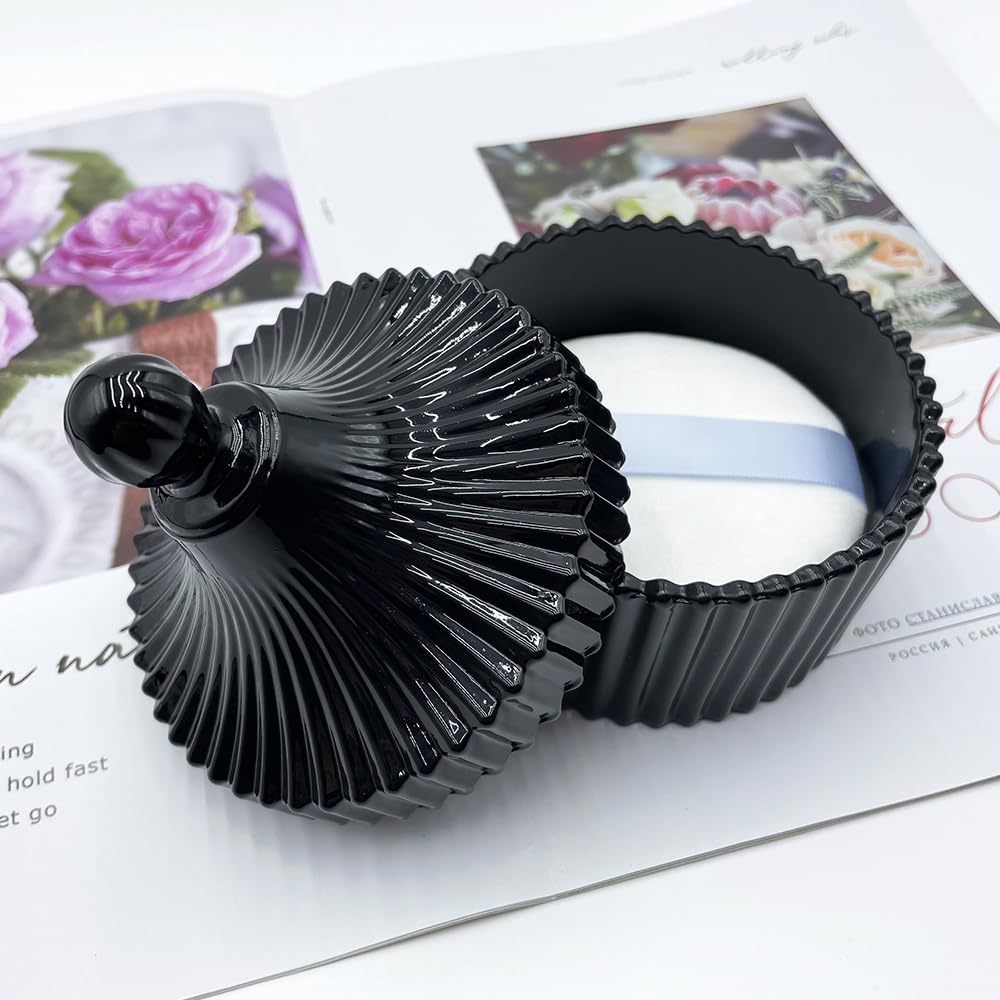 Ultra Soft Powder Puff and Container 3.3" High Density Velvet Dusting Washable Reusable Powder Puff,Body Powder Puff and Glass Jar Holder Loose Powder Box with Puff for Face Makeup(Black)