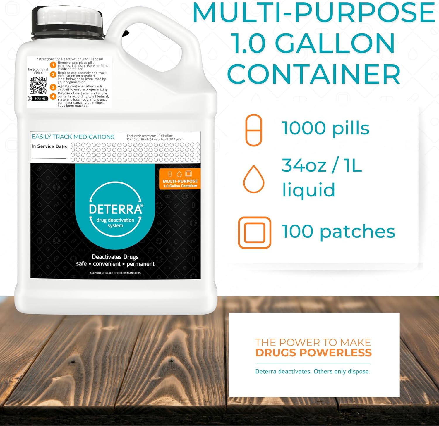 • Effective: The ONLY drug deactivation container scientifically proven to work. The drug deactivation container provides a safe, convenient and permanent disposal of unused, expired or unwanted medications at home or in a clinical setting. Each container will deactivate and dispose of up to 1,000 pills, 34oz/1L or 100 patches at a time.