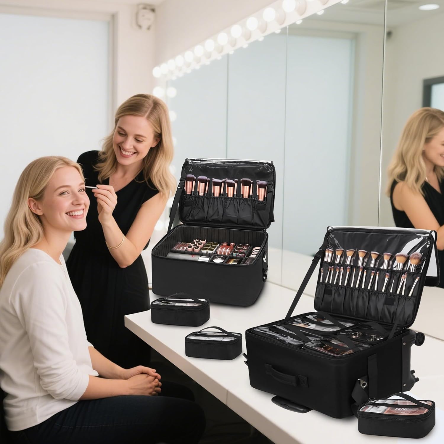- 【Extra Large Makeup Travel Bag】: 2-in-1 professional trolley case consists of 2 makeup cases and 7 pouches. The makeup cases have freely adjustable dividers, contain lipstick panels, insulation trolley case front pockets, Abundant internal storage space to meet the makeup artist's storage needs for cosmetics, hair tools, etc.