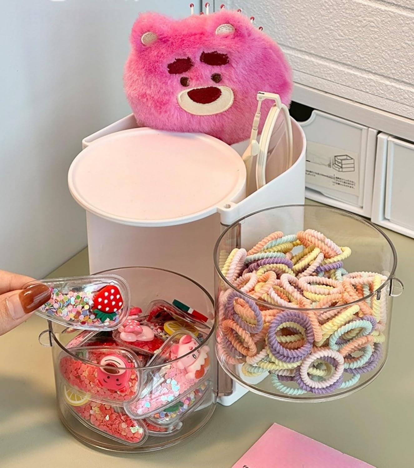 - â ăSimple and Practicală The hair tie organizer two-grid design on the top can be used to store different types of items, keeping the desktop neat and tidy. This design is not only convenient for temporary storage of daily necessities, but also can be used at any time, providing great convenience and flexibility for your life!