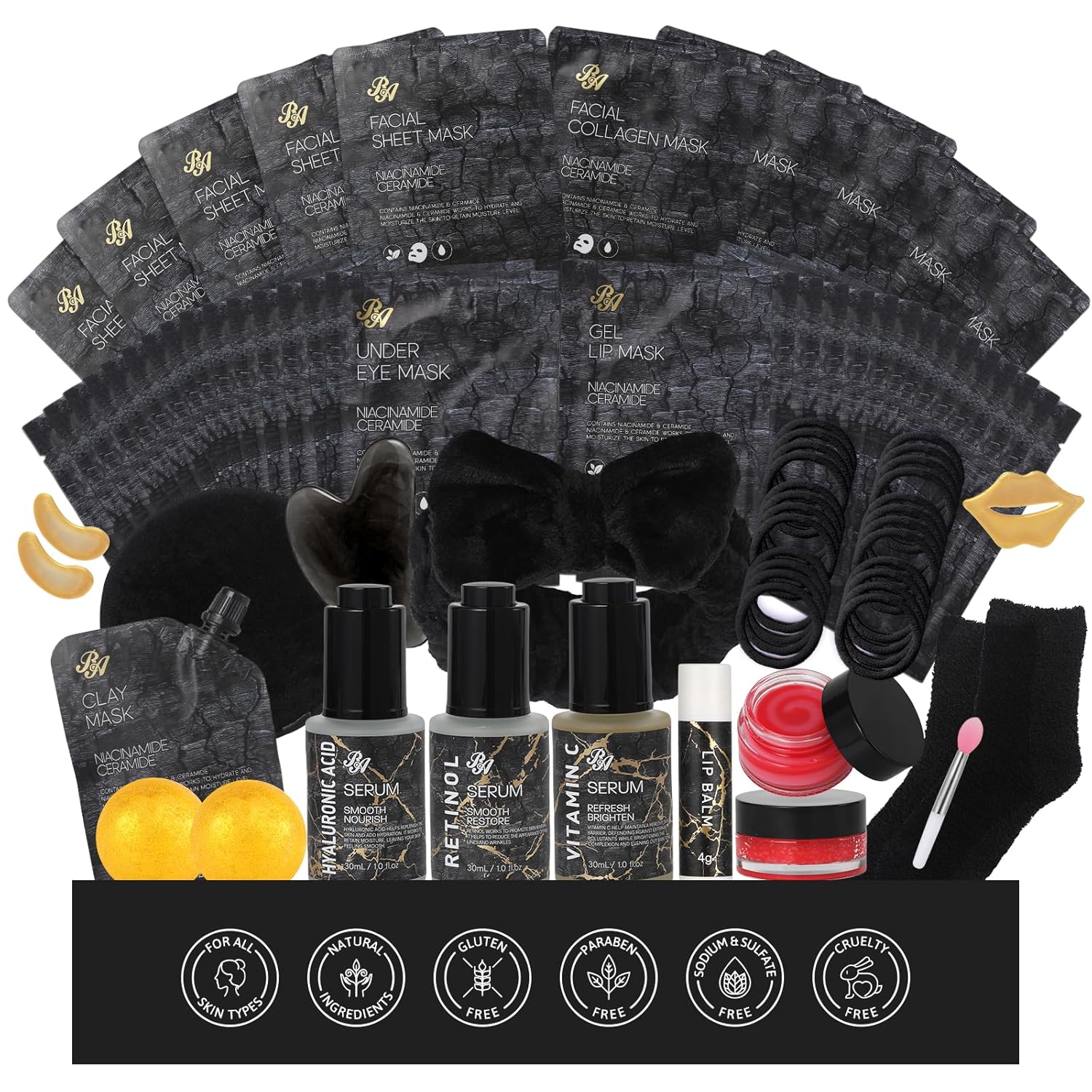 - 55 PCS Advanced Skin Care Set: This complete gift set contains essential oil facial skin care products with 5 pcs sheet mask, 5 pcs hydrolyzed real collagen mask, 15 pcs gel under eye patches, 15 pcs gel lip mask, 20ml lip mask, 20ml lip scrub, 30ml clay mask, 30ml orange face serum, 30ml rose face serum, 30ml hyaluronic acid face serum, bath bombs, spa headband, sock, gua sha tool, hair ties, face clean sponge