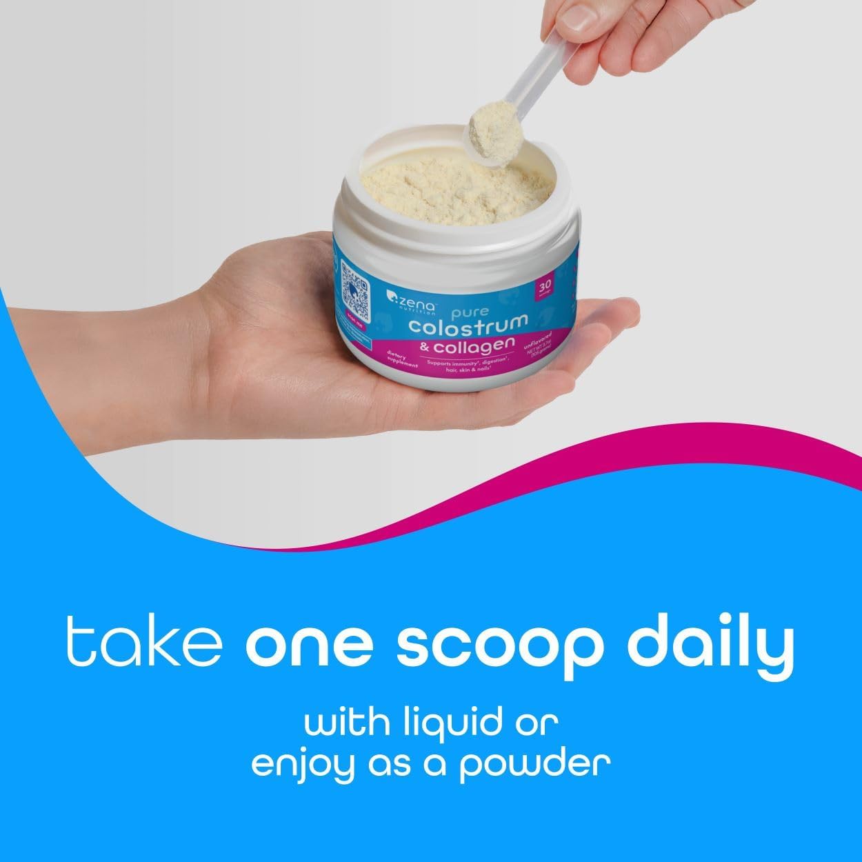 - Easy to Prepare: Taking our colostrum collagen powder is easy. Pour one scoop into a glass or bottle, pour 8 to 10 ounces of a cold beverage, and mix or shake well; Because our pure colostrum collagen powder is unflavored and made with no additives, it is easy to mix into your favorite cold beverages without affecting the flavor
