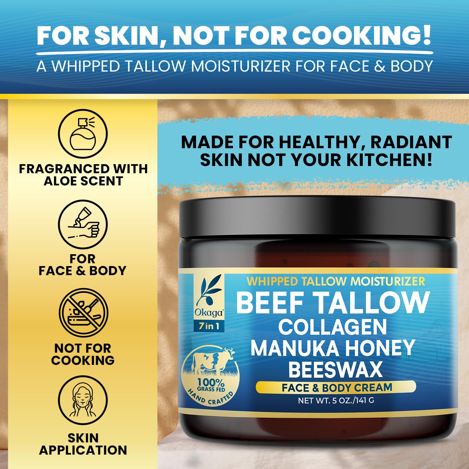 - Multi-Purpose Daily Moisturizer: Designed for all skin types, Okaga Beef Tallow Balm can be used as a daily facial moisturizer, nourishing body lotion, or soothing lip balm. Free from harsh chemicals and synthetic additives, this gentle yet effective formula keeps your skin feeling soft, hydrated, and comfortable, making it an essential, versatile part of your daily skincare routine.