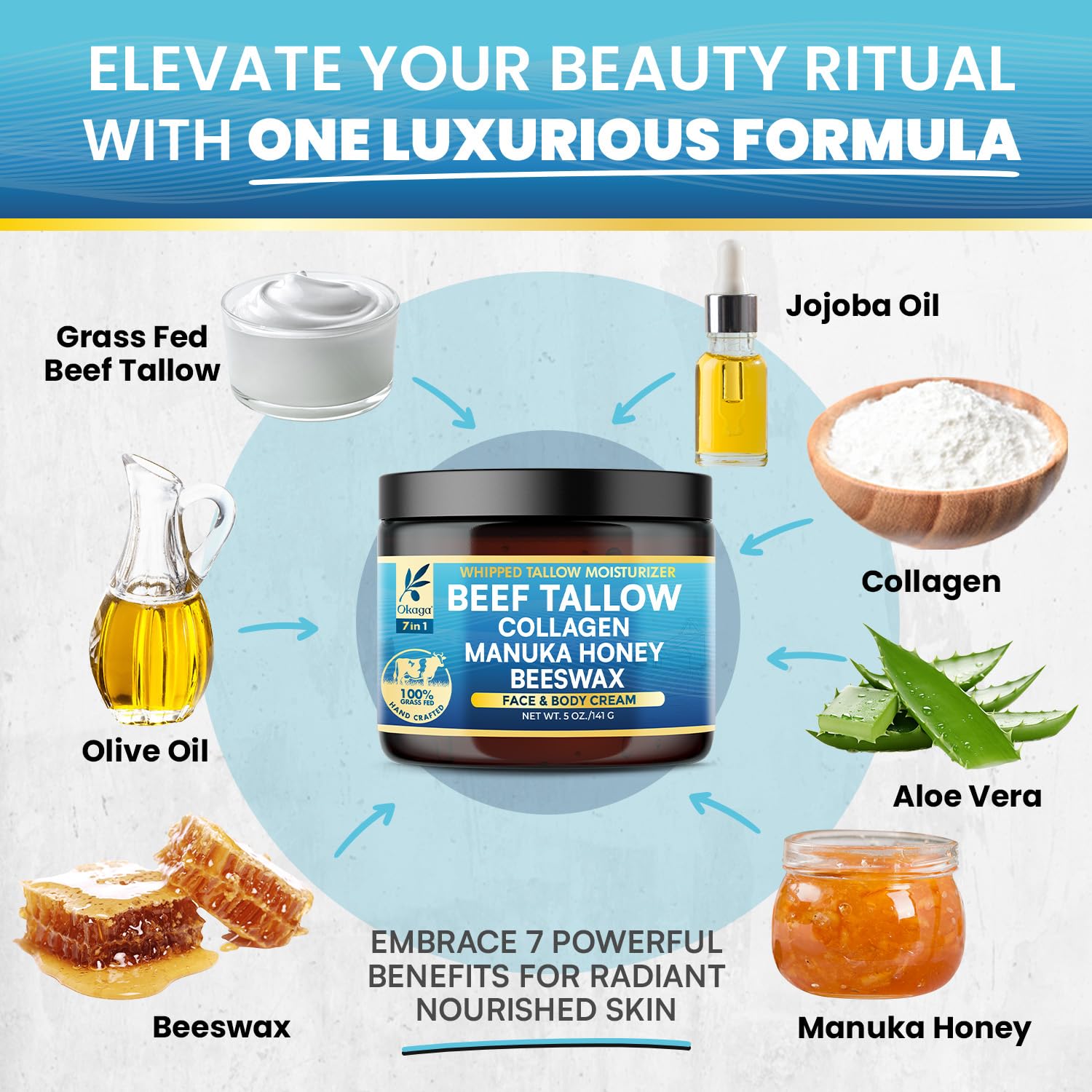 - Organic Grass-Fed Ingredients: Okaga Beef Tallow Balm contains organic grass-fed beef tallow combined with manuka honey, aloe vera, jojoba oil, olive oil, beeswax, and collagen. This powerful blend quickly absorbs into your skin, providing deep hydration without greasy residue, ideal for moisturizing your face, body, and lips, leaving skin soft, nourished, and noticeably revitalized daily.