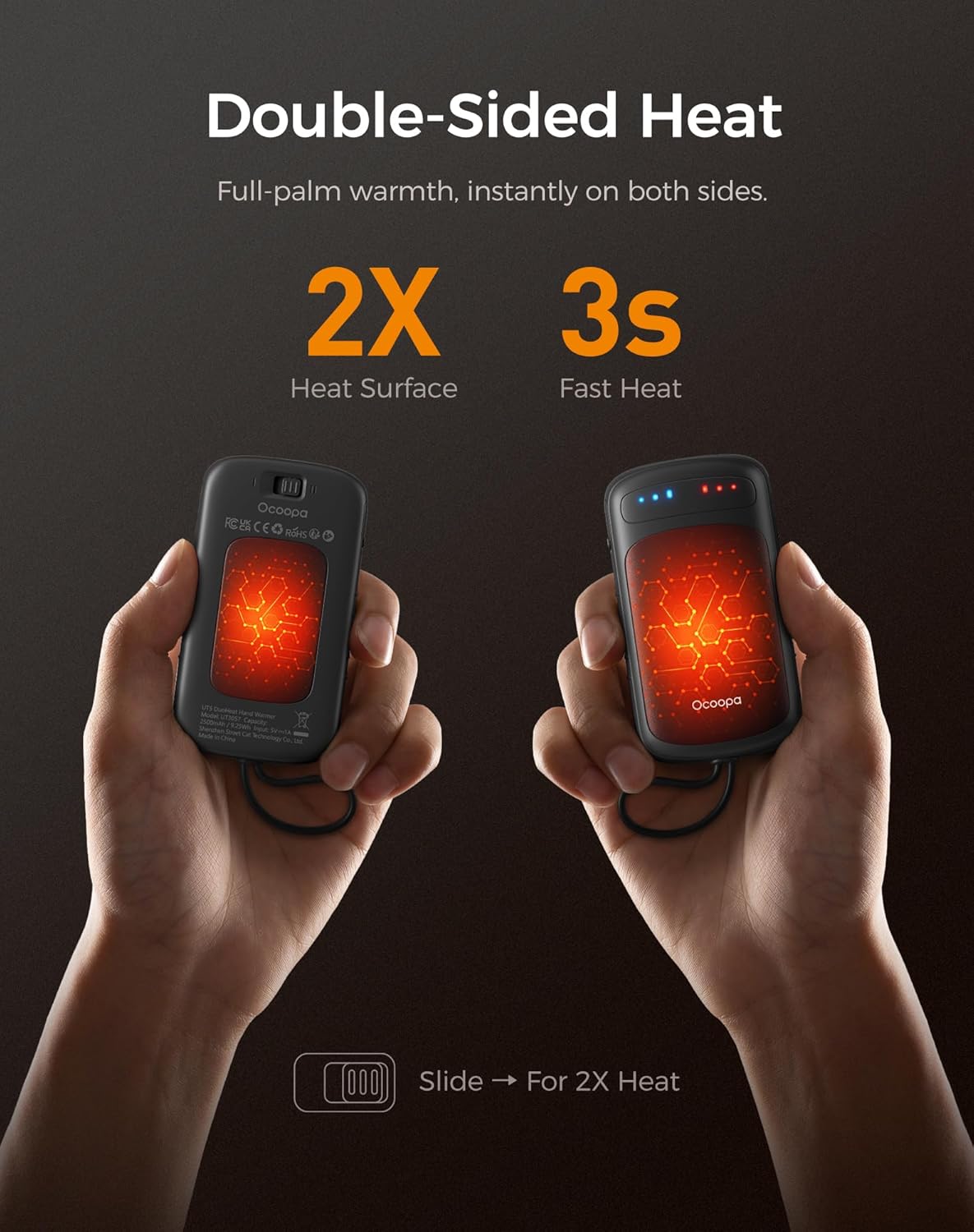 - Instant Full-Palm Warmth â Double heat area with the dual-sided electric hand warmers, heats up in just 3 seconds, full-palm warmth from palm to fingers, perfect for camping, hunting, fishing, hiking, or the daily winter outdoors.